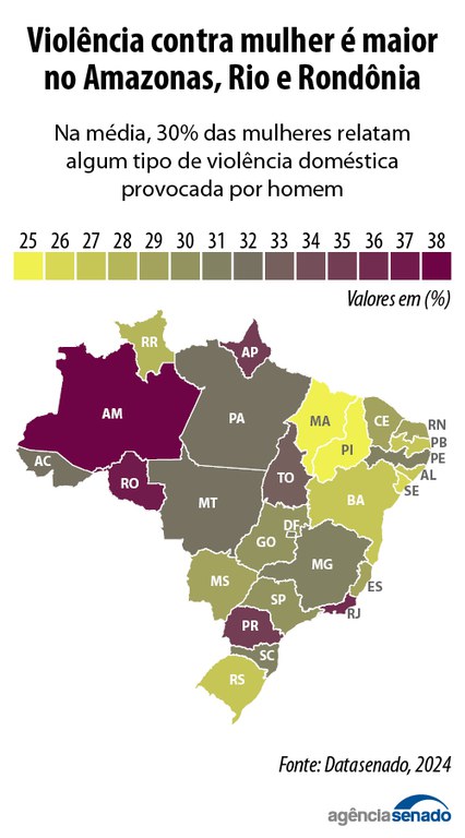 Os dados também revelaram que os estados do Rio de Janeiro (36%), de Rondônia (37%) e do Amazonas (38%) registraram os maiores índices de mulheres que declararam ter sofrido violência doméstica ou familiar provocada por homens. A média nacional é de 30% delas.